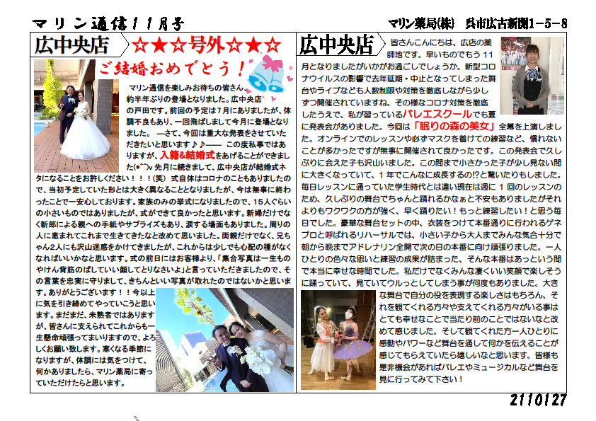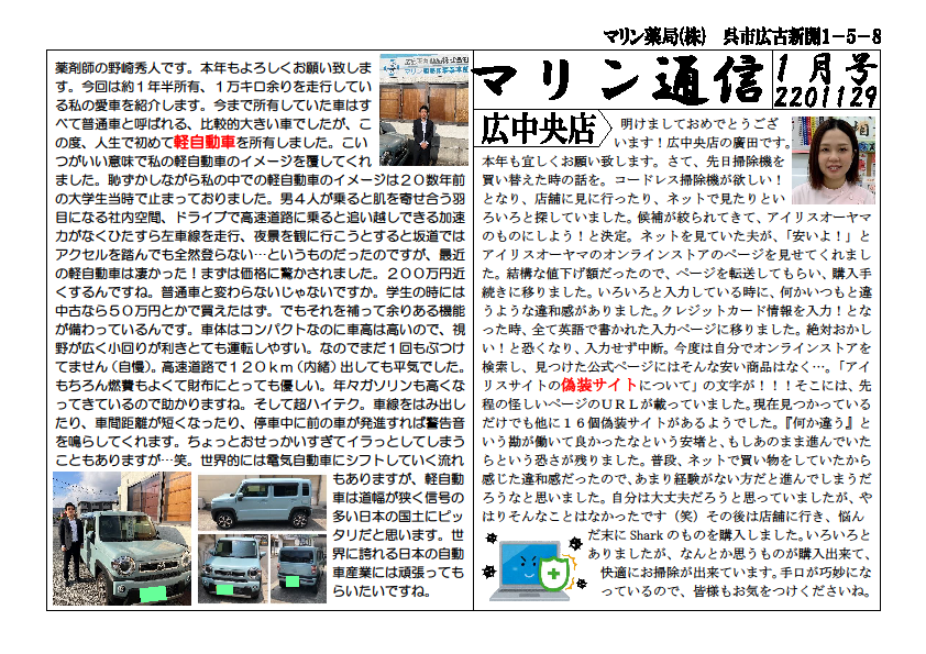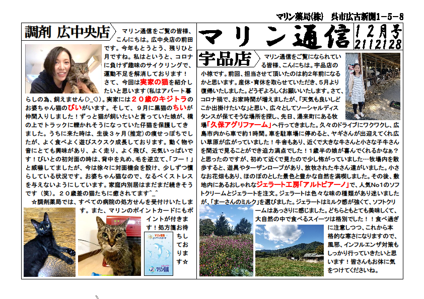 マリン通信 マリン薬局では年4回、マリン薬局でのニュース、季節での流行する風邪対策、薬の豆知識などなど…皆様に必ず役立つ情報を提供しています。マリン薬局のスタッフ総出で制作しています。毎回スタッフの顔付きで解説はとても楽しく、読んで頂いたお客さまからお店で感想などをお聞かせ頂いたり、お客様とのコミュニケーションの一つと思いご提供させて頂きます。画像をクリックすると別画面で表示されます。もし、見れない場合は店頭にて配布いたしますので、各店舗のスタッフへお問い合わせ下さい。 最新号 2025年04月号 2025年01月号 2024年10月号 2024年07月号 2024年04月号 2023年12月号 2023年09月号 2023年07月号 2023年04月号 2023年01月号 2022年10月号 2022年06月号 2022年03月号 2022年02月号 2021年12月号 2021年12月号 2021年10月号 2021年10月号